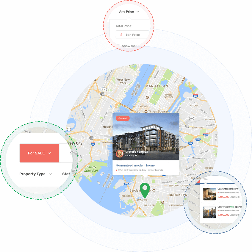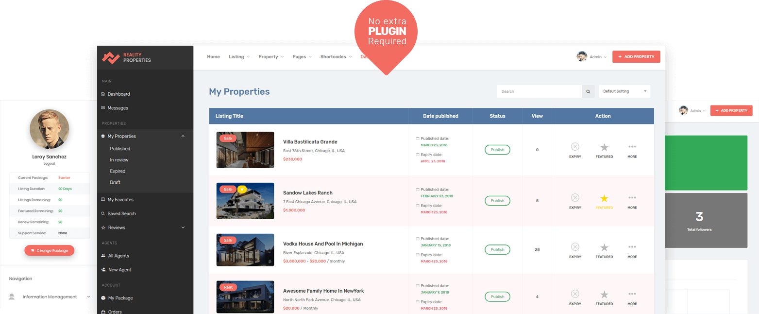 Create unlimited custom fields, features and amenities, add images, video, manage property google maps settings, or assign the listing to any user type (agent, user, agency or developer…)